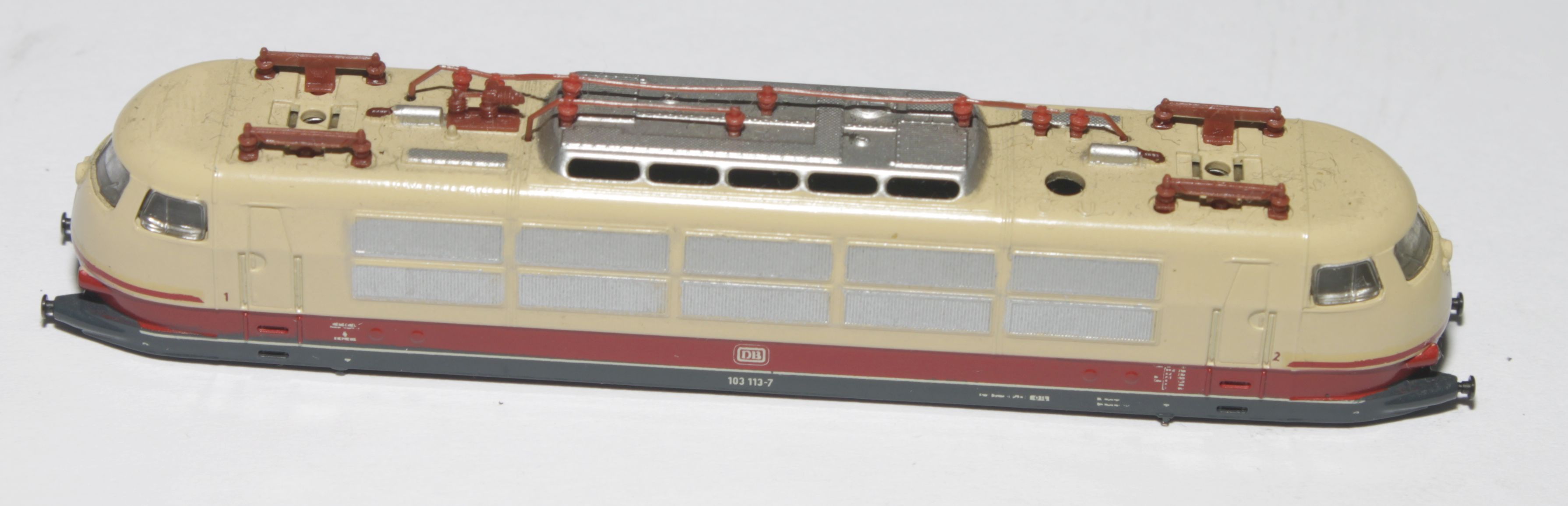 Lokaufbau der Baureihe BR 103 Art-Nr. des Herstellers 26236 bzw. 262360. Mit weißem DB-Keks, Aufschrift 103 113-7, inkl. Dachaufbauten, inkl. Lichtkörper, inkl. Fenstereinsätze, inkl. Abschirmblech, inkl. Puffe Zustand 3 - eine Dachleitung ist gebrochen, sonst wie auf den Fotos